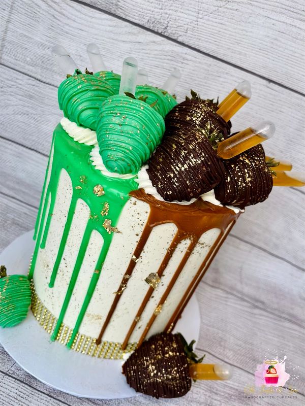 Chocolate cake layered with whipped chocolate buttercream icing and decorated with chocolate ganache, strawberries and chocolate chips