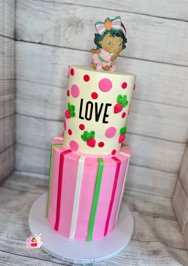 Strawberry cake layered with vanilla buttercream filling, covered in buttercream icing and strawberry crunch topping, topped with strawberries and whipped cream